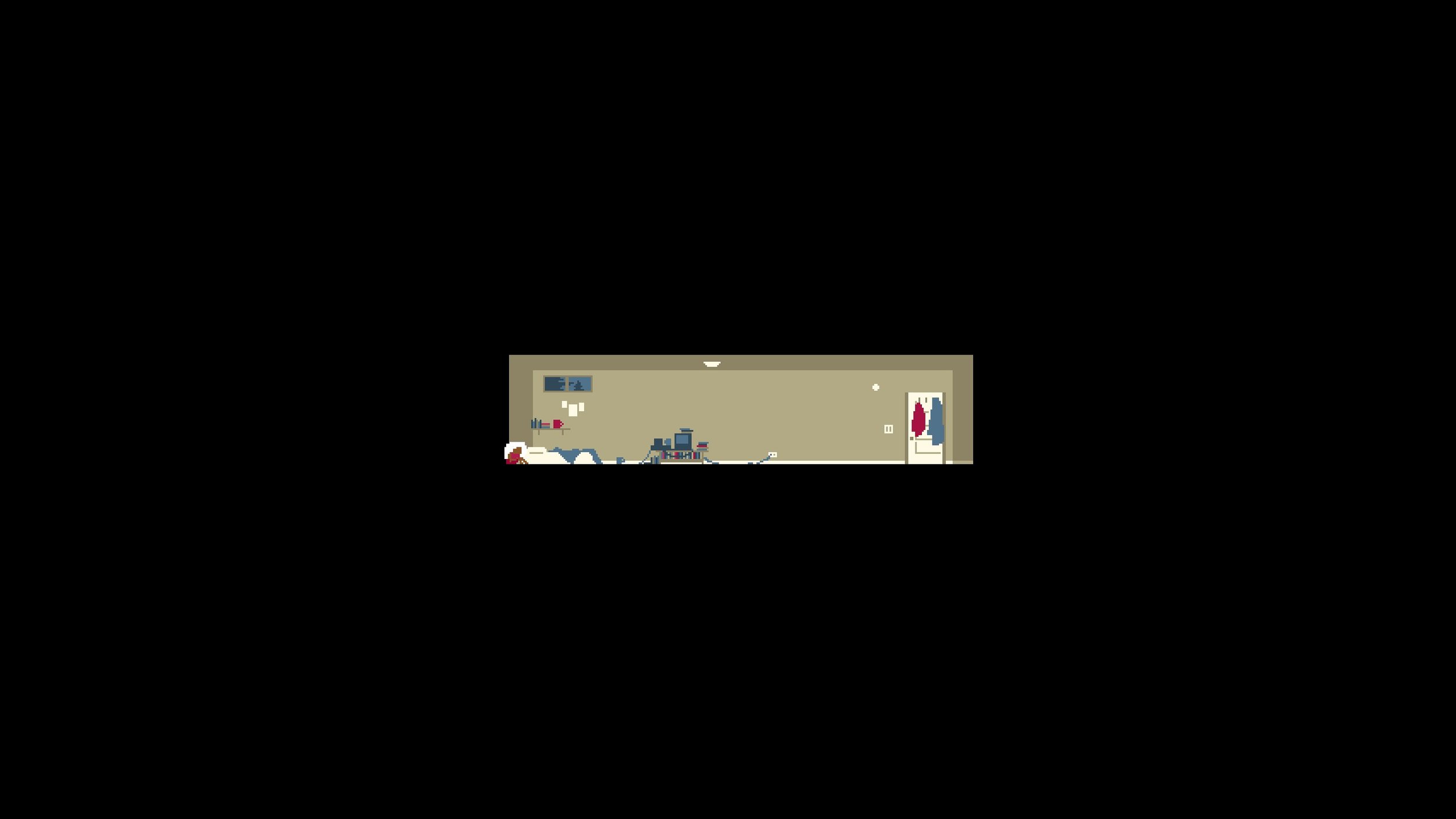 I also want to take a moment to talk about Love Eternal’s visual style. Maybe the most interesting to me was the use of negative space. In the opening scenes of the game, you exist in a small rectangle at the center of the screen. Your bedroom, the hallway, and then the family dining room. It’s unusual for a game to leave so much space unused. This changes when the platforming starts, but the game repeatedly returns to this ominous, claustrophobic viewpoint and eventually uses that negative space to reveal more of the ongoing story and perhaps what was happening outside that small box all along.